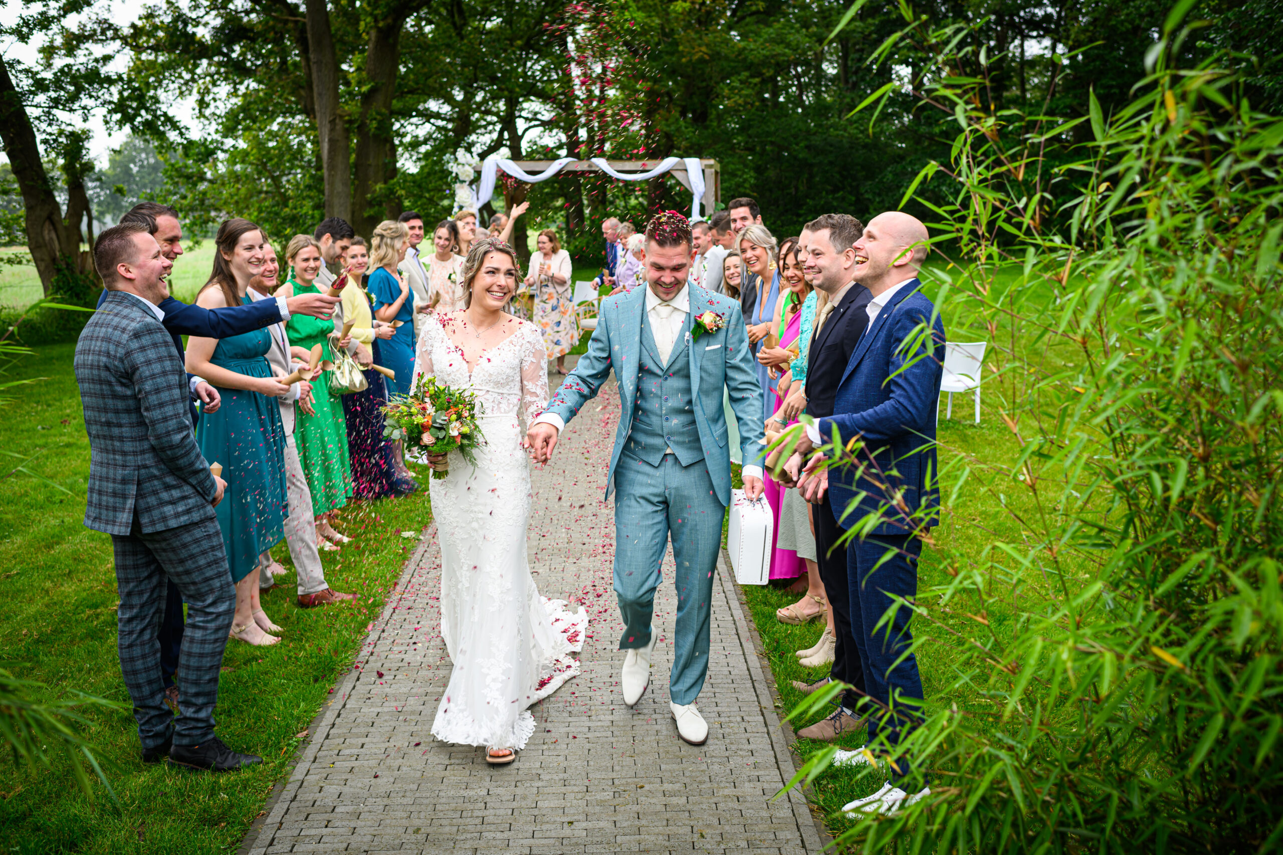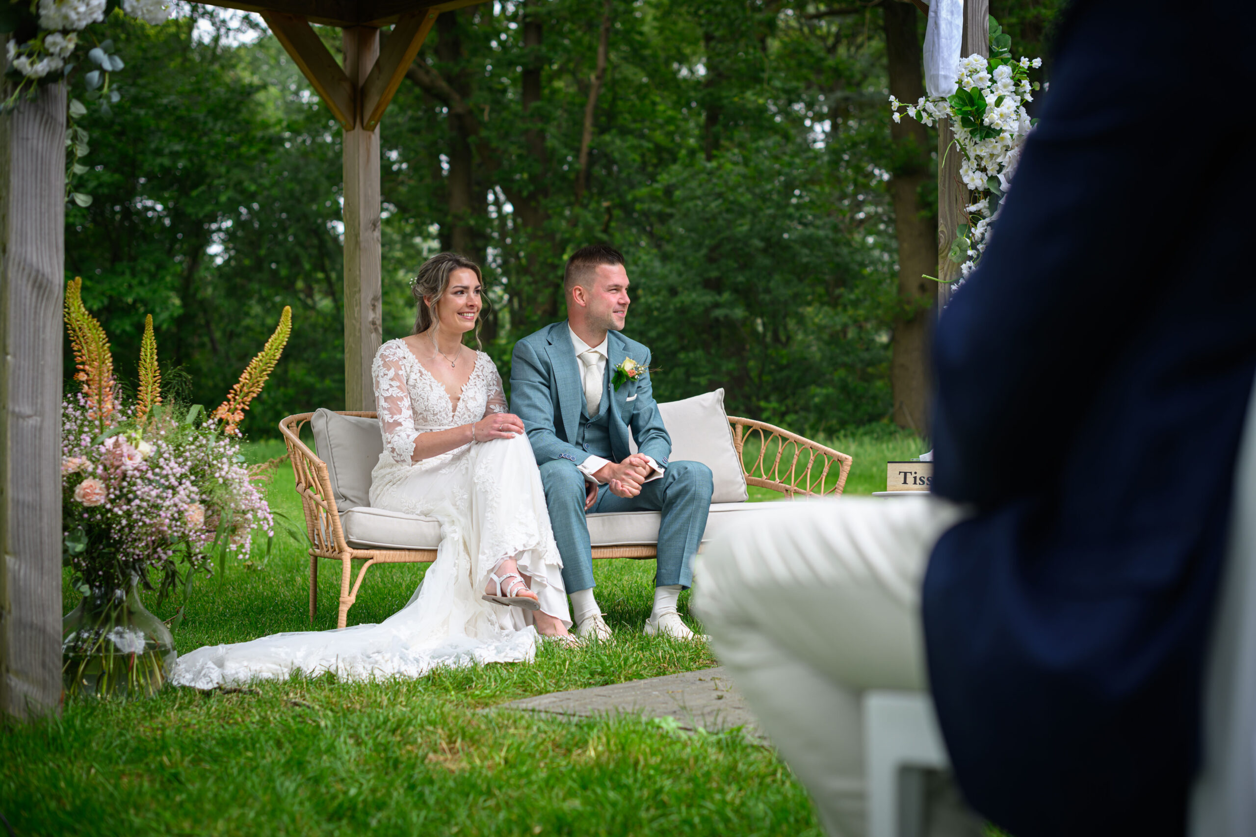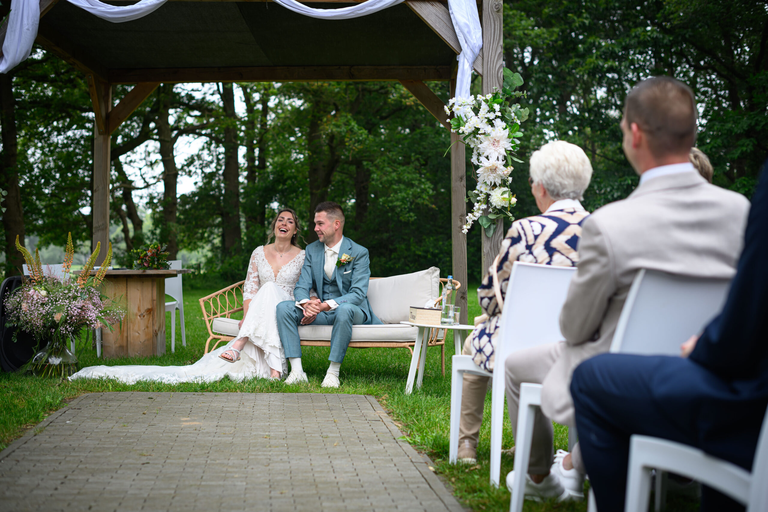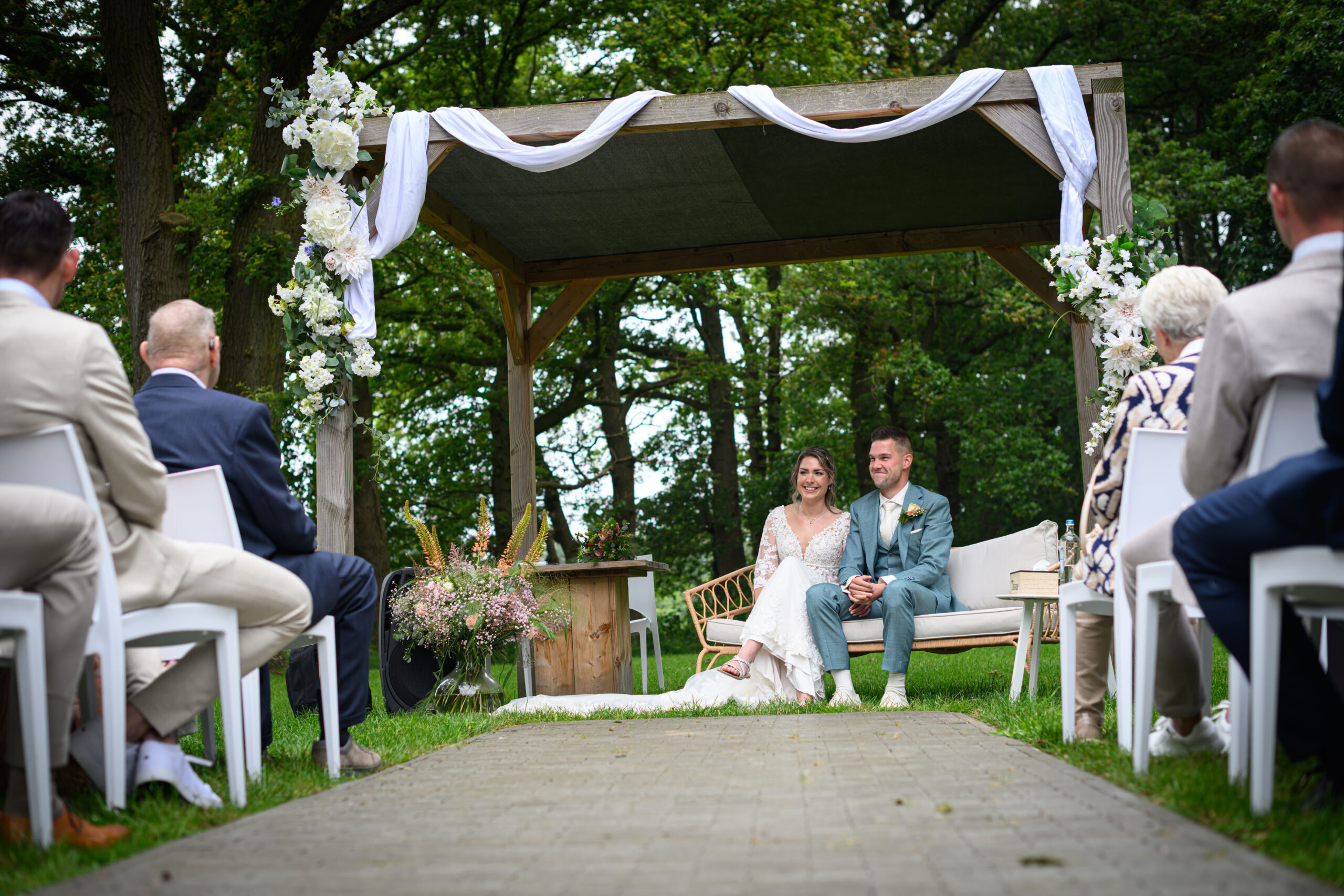Hun dag begon droog, maar helaas begon het toch wel te miezeren tijdens de ceremonie… en wat doe je dan? Gewoon KEIHARD negeren! En niet alleen het bruidspaar, maar alle daggasten ook! Hah!